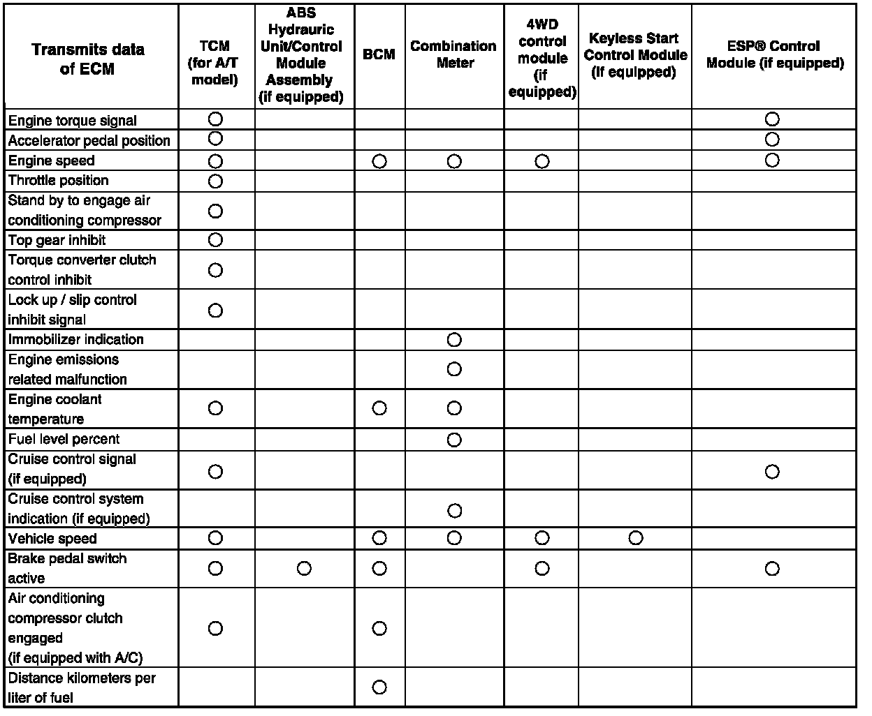 NOTE: In communication between ECM and combination meter, between ECM and keyless start control module (if equipped) and between ECM and 4WD control module (if equipped), data is transmitted only from ECM to combination meter, keyless start control module (if equipped) and 4WD control module (if equipped). (Combination meter, keyless start control module (if equipped) and 4WD control module (if equipped) does not transmit data to ECM.)