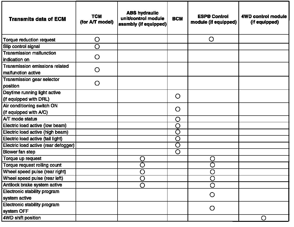 CAN Communication System DescriptionECM(1), ABS / ESP(R) control module (2), TCM (for A/T model) (3), BCM (4), 4WD control module (if equipped) (5), combination meter (6), keyless start control module (if equipped) (7) and steering angle sensor (if equipped) (8) of this vehicle communicate control data between each control module.