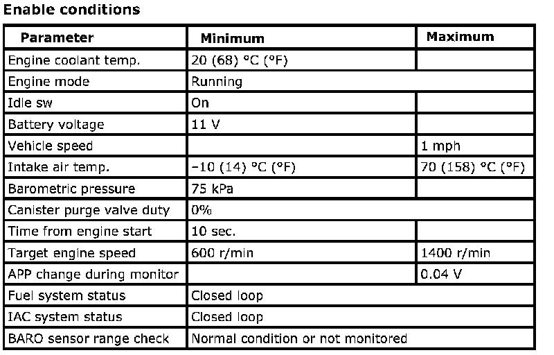 The Idle Air Control (IAC) throttle valve opening functionally checked by monitoring the closed loop idle speed correction required to maintain the desired idle rpm. If the proper idle rpm cannot be maintained and the system has a high rpm (+200) or low rpm error (100) greater than the malfunction threshold, an IAC malfunction is indicated. (P0507, P0506)