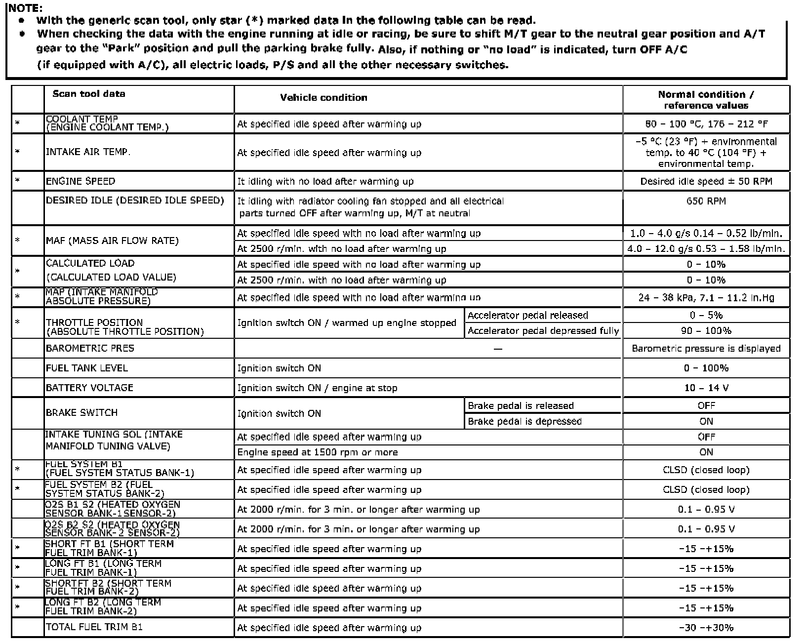 Scan Tool DataAs the data values are standard values estimated on the basis of values obtained from the normally operating vehicles by using a scan tool, use them as reference values. Even when the vehicle is in good condition, there may be cases where the checked value does not fall within each specified data range. Therefore, judgment as abnormal should not be made by checking with these data alone.