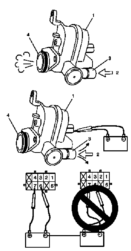 4. Connect 12 V-battery to terminal "6" and terminal "7" of EVAP leak check module. In this state, blow breath from port (3).
