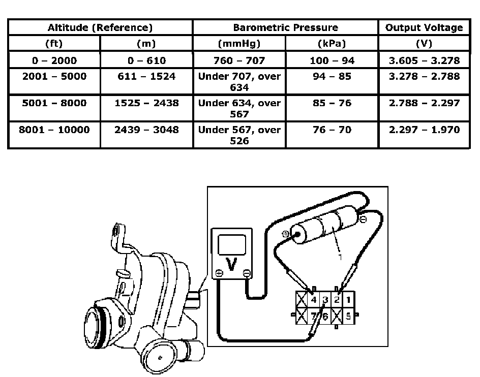 EVAP leak check pressure sensor output voltage for initial (barometric) pressure (Terminal "4" voltage 4.5 - 5.5 V, ambient temp. 20 - 30 degrees C (68 - 86 degrees F))