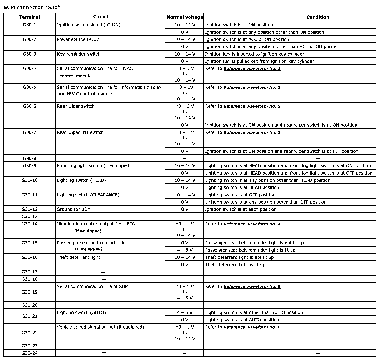 - As each terminal voltage is affected by the battery voltage, confirm that it is 11 V or more when ignition switch is ON.