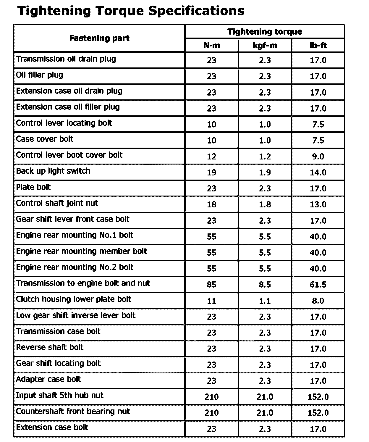 Tightening Torque Specifications