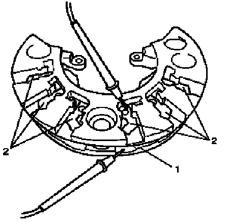 1. Using an ohmmeter, connect one tester probe to negative terminal (1) and the other to each rectifier terminal (2).