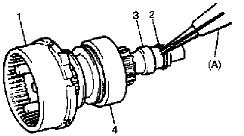 10. Remove snap ring (2), then pull out pinion stop ring (3) and over-running clutch (4) and internal gear (1).