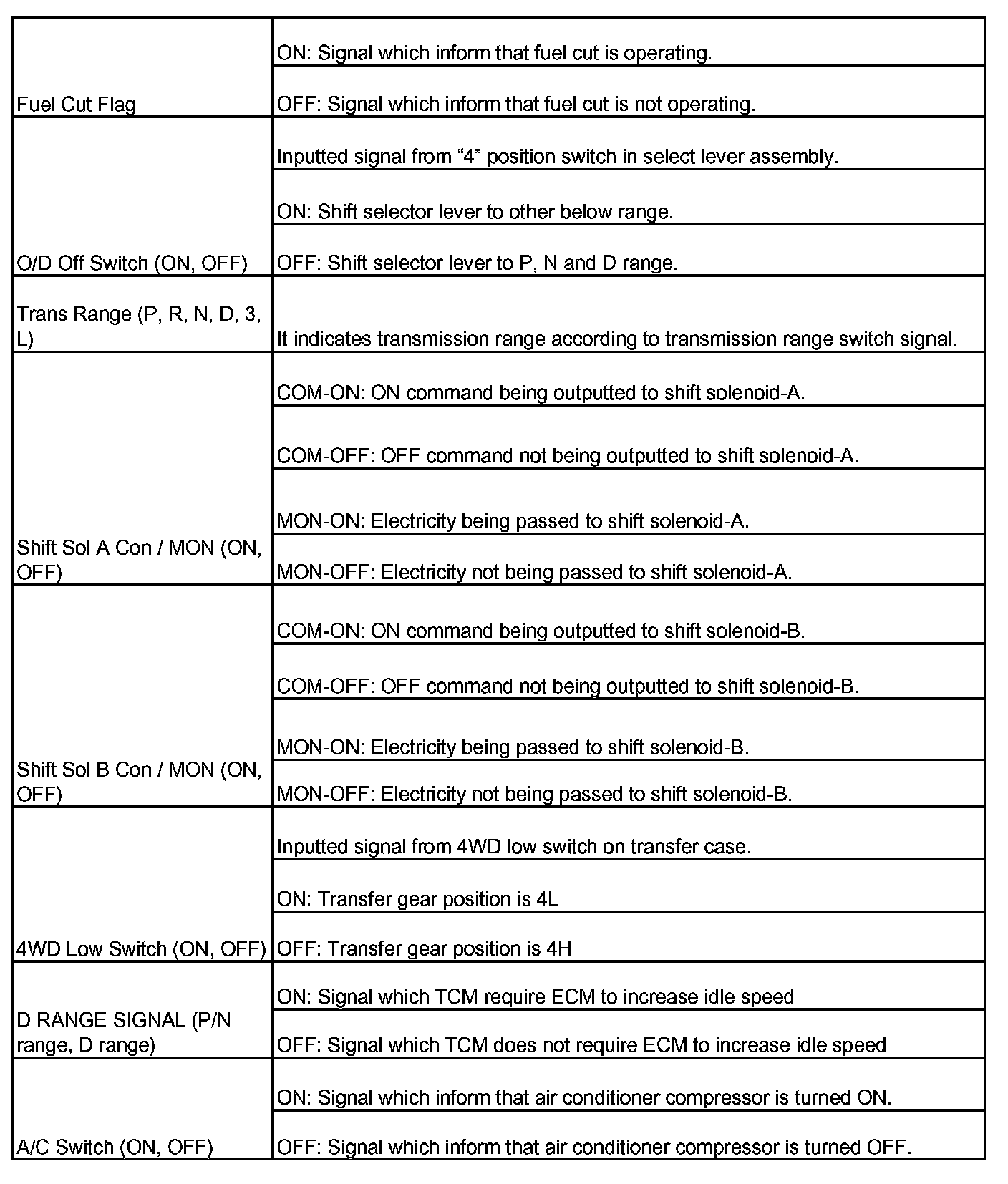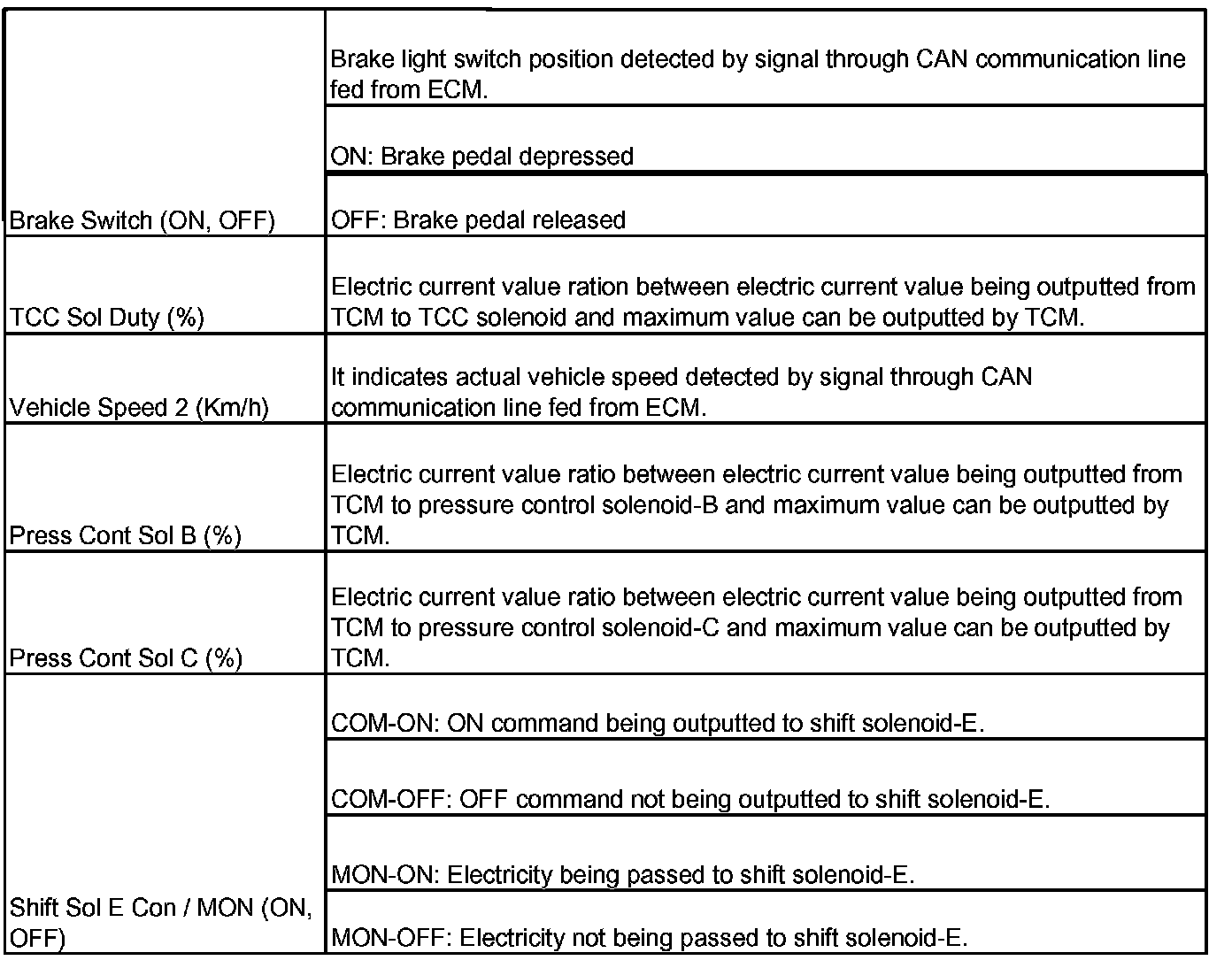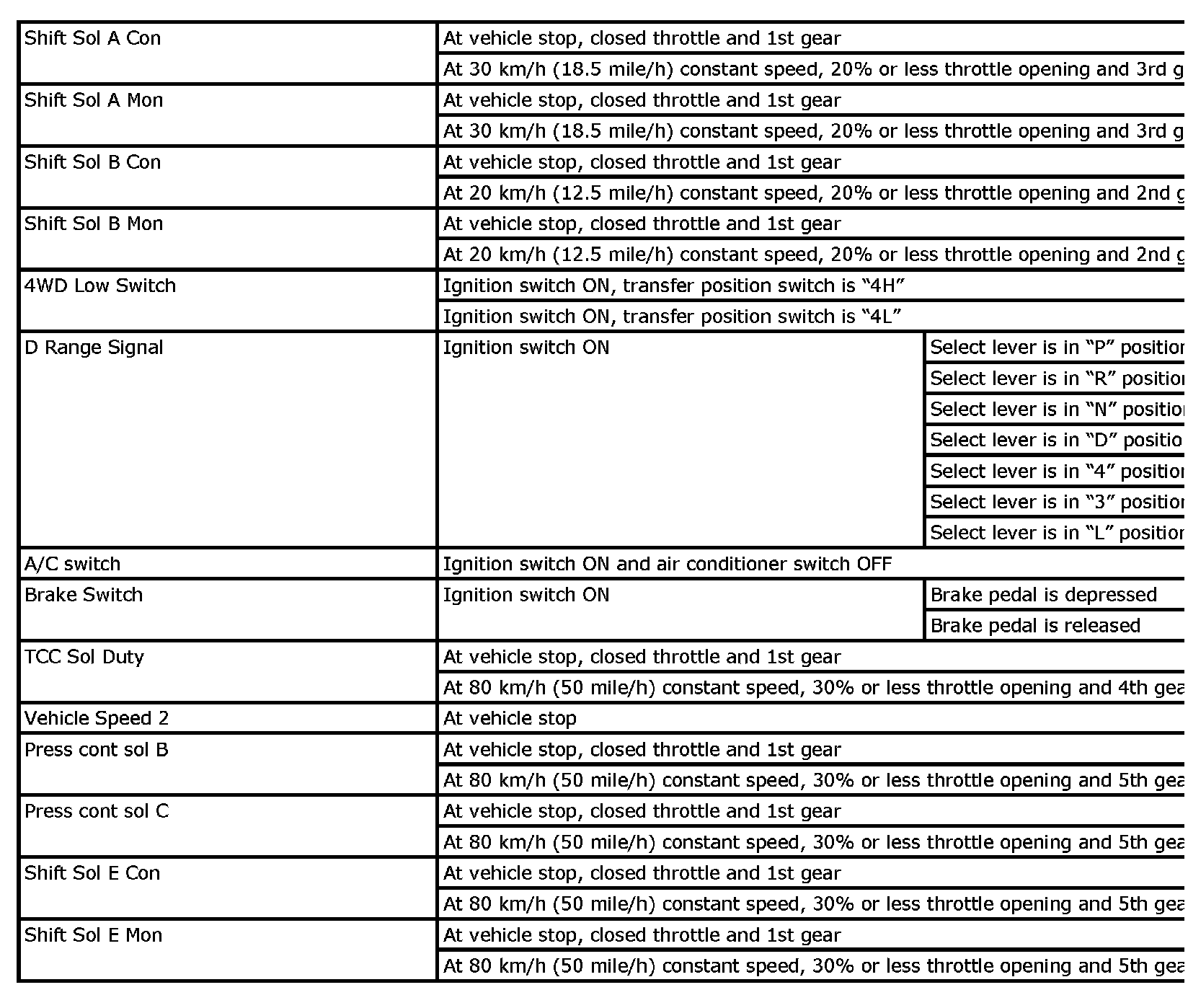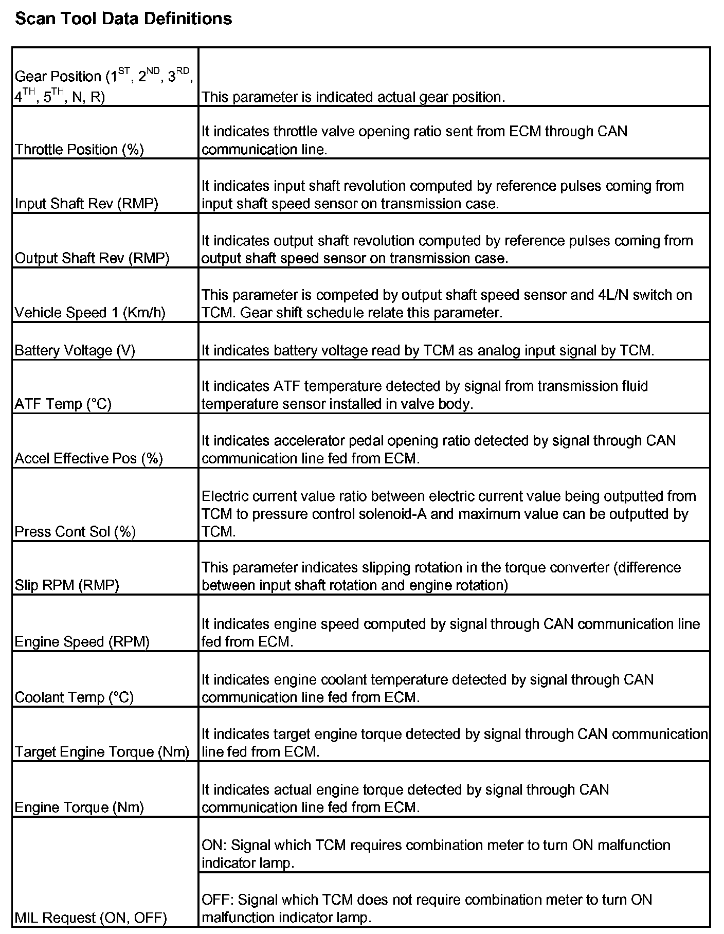 Scan Tool DataAs the data values given in the following table are standard values estimated on the basis of values obtained from the normally operating vehicles by using a scan tool, use them as reference value. Even when the vehicle is in good condition, there may be cases where the checked value does not fall within each specified data range. Therefore, judgment as abnormal should not be made by checking with these data alone. Also, condition in the following table that can be checked by the scan tool are those detected by TCM and output from TCM as commands and there may be cases where the automatic transmission or actuator is not operating (in the condition) as indicated by the scan tool.