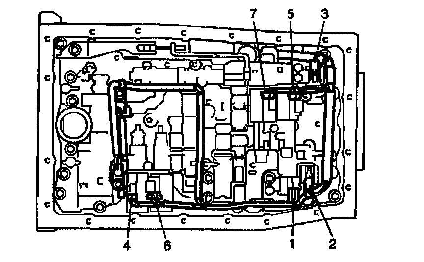 8. Disconnect shift solenoid-A connector (1), shift solenoid-B connector (2), shift solenoid-E connector (3), TCC solenoid connector (4), Pressure control solenoid-A connector (5), Pressure control solenoid-B connector (6) and Pressure control solenoid-C connector (7).