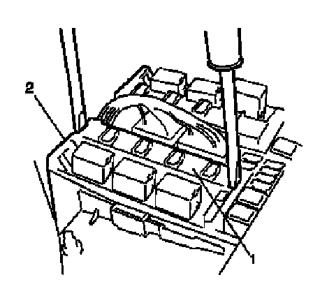 2. Remove rear end door window defogger relay (included in integration relay) (1) from main fuse box (2).