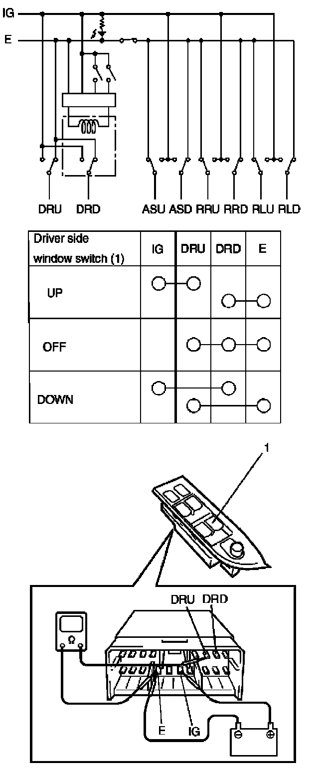 3. Connect 12 V battery positive (+) terminal to terminal "IG" of power window main switch and its negative (-) terminal to terminal "E" of power window main switch.