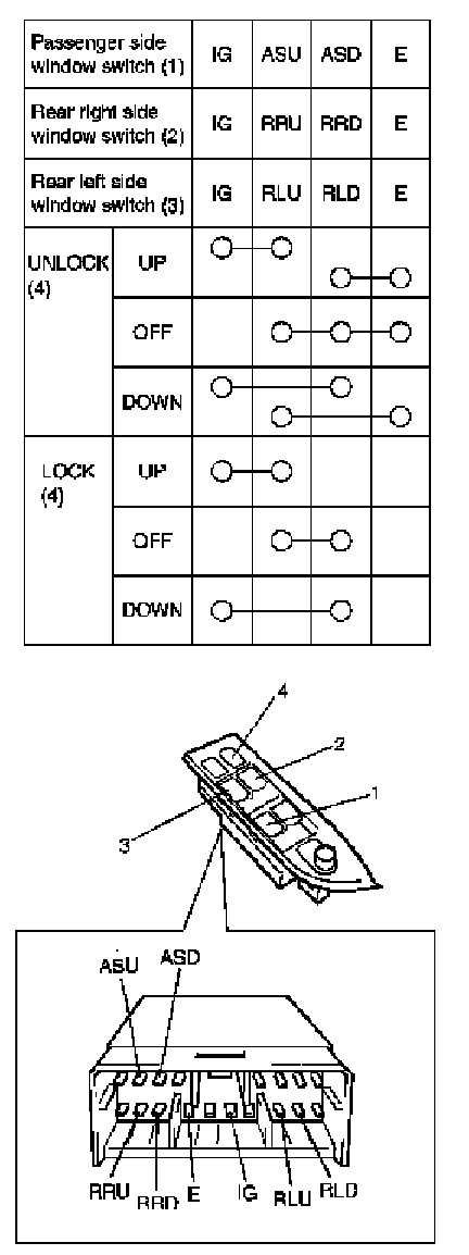 4. Check for continuity between terminals as shown below. If check result is not as specified, replace power window main switch.