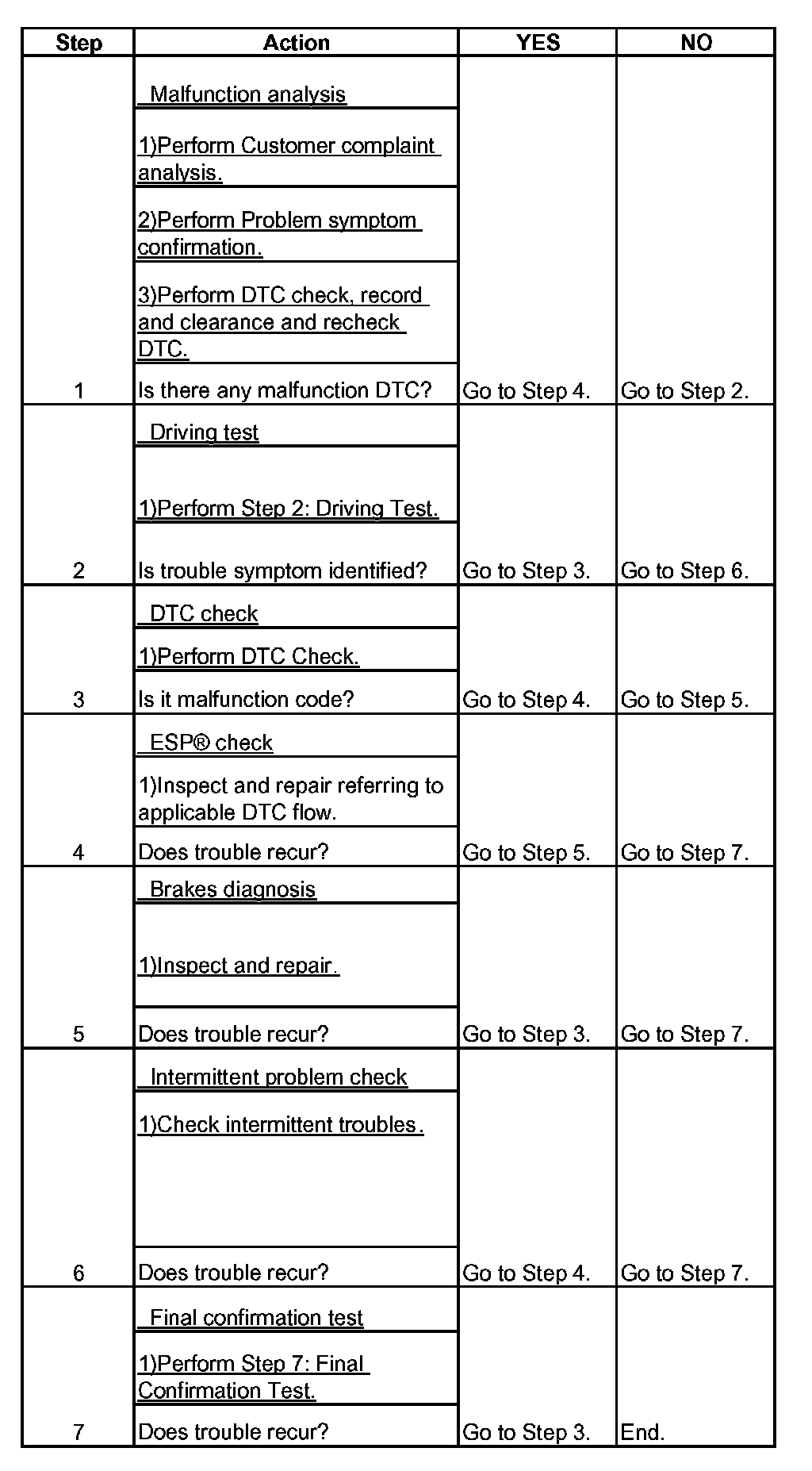 When DTC which is recorded at DTC check procedure is detected again after performing DTC clearance, go to Step 4: ESP(R) Check to proceed the diagnosis.