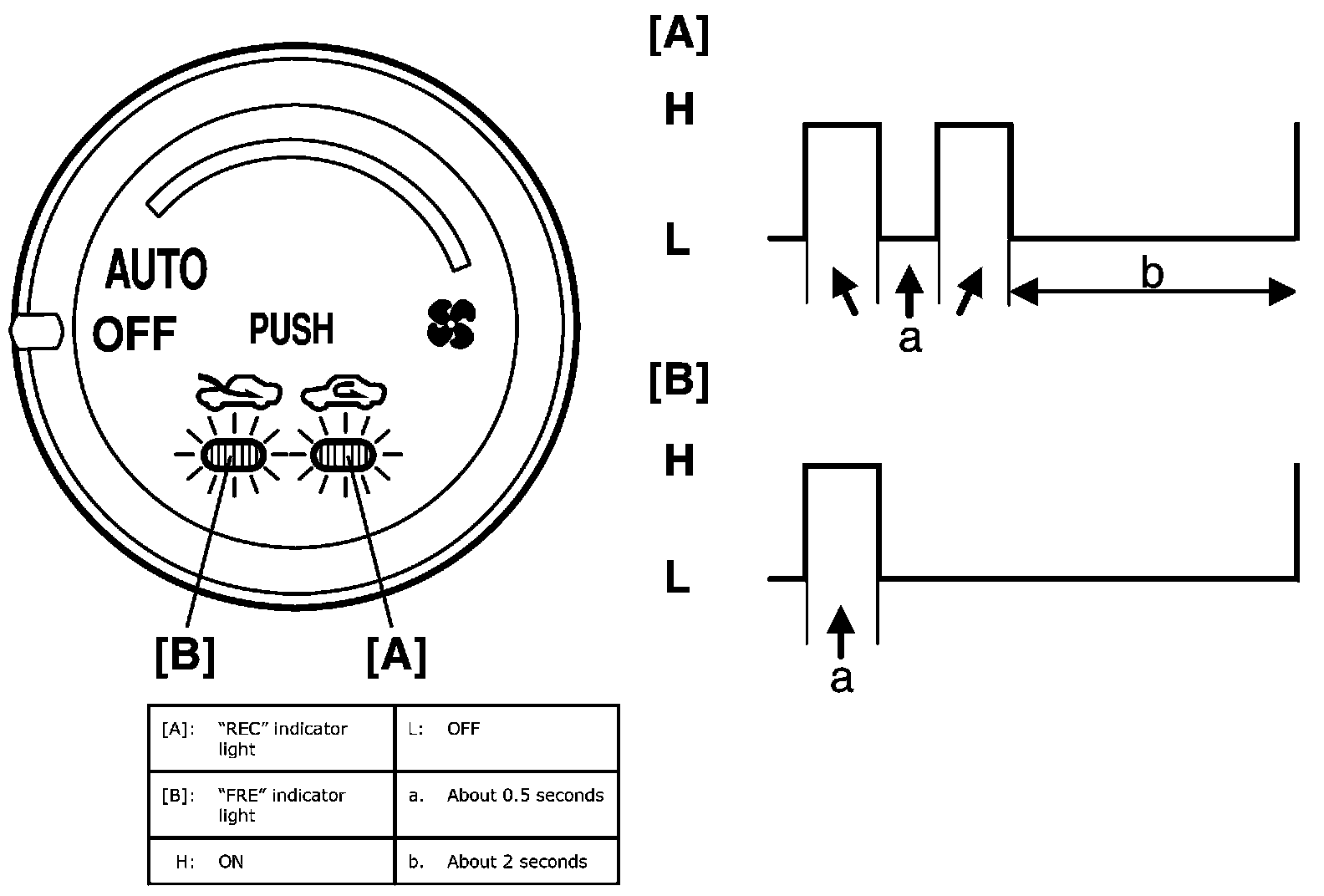 NOTE: When no DTC is detected, "FRE"[A] and "REC"[B] indicator lights on HVAC control module flash at the same time in specific pattern.