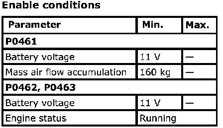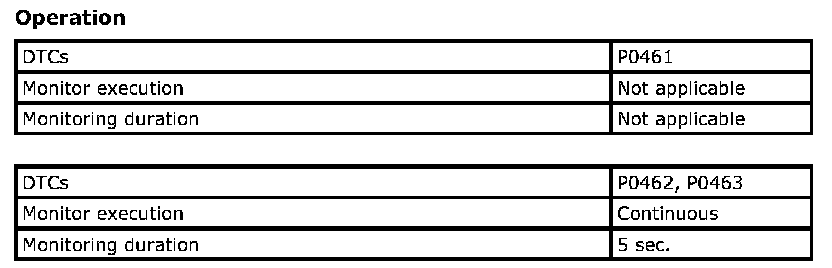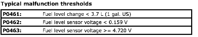 Refer to DTC P0462 / P0463: Fuel Level Sensor Circuit Low / High. P0463