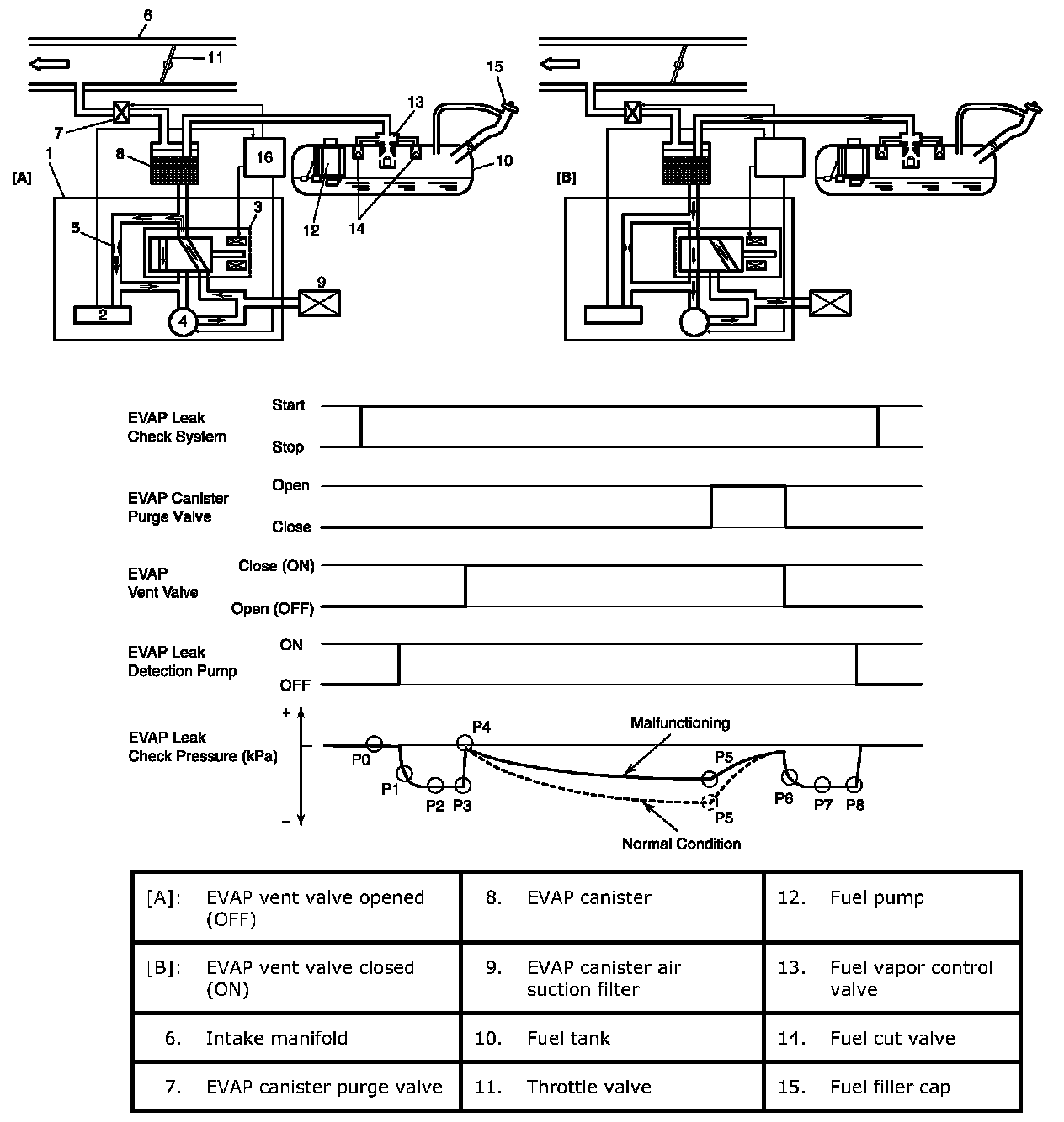 NOTE: If ECM detects EVAP leak check system malfunction by measuring EVAP leak check pressure (P1 - P4 and P6 - P8), ECM stops EVAP leak check and store it as applicable pending DTC. When starting engine after detecting the same system malfunction two times, ECM turns on MIL.