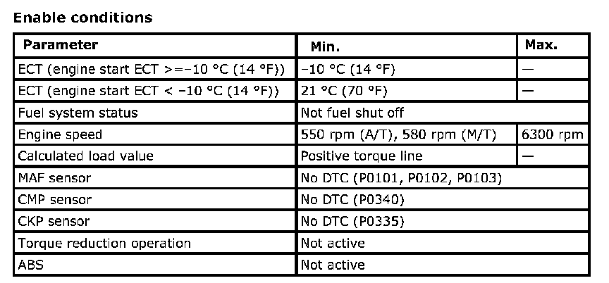 ECM measures the angle speed of the crankshaft based on the pulse signal from the CKP sensor and CMP sensor for each cylinder. If it detects a large change in the angle speed of the crankshaft, it concludes occurrence of a misfire. When the number of misfire is counted by the ECM beyond the DTC detecting condition, it determines the cylinder where the misfire occurred and outputs it as DTC.