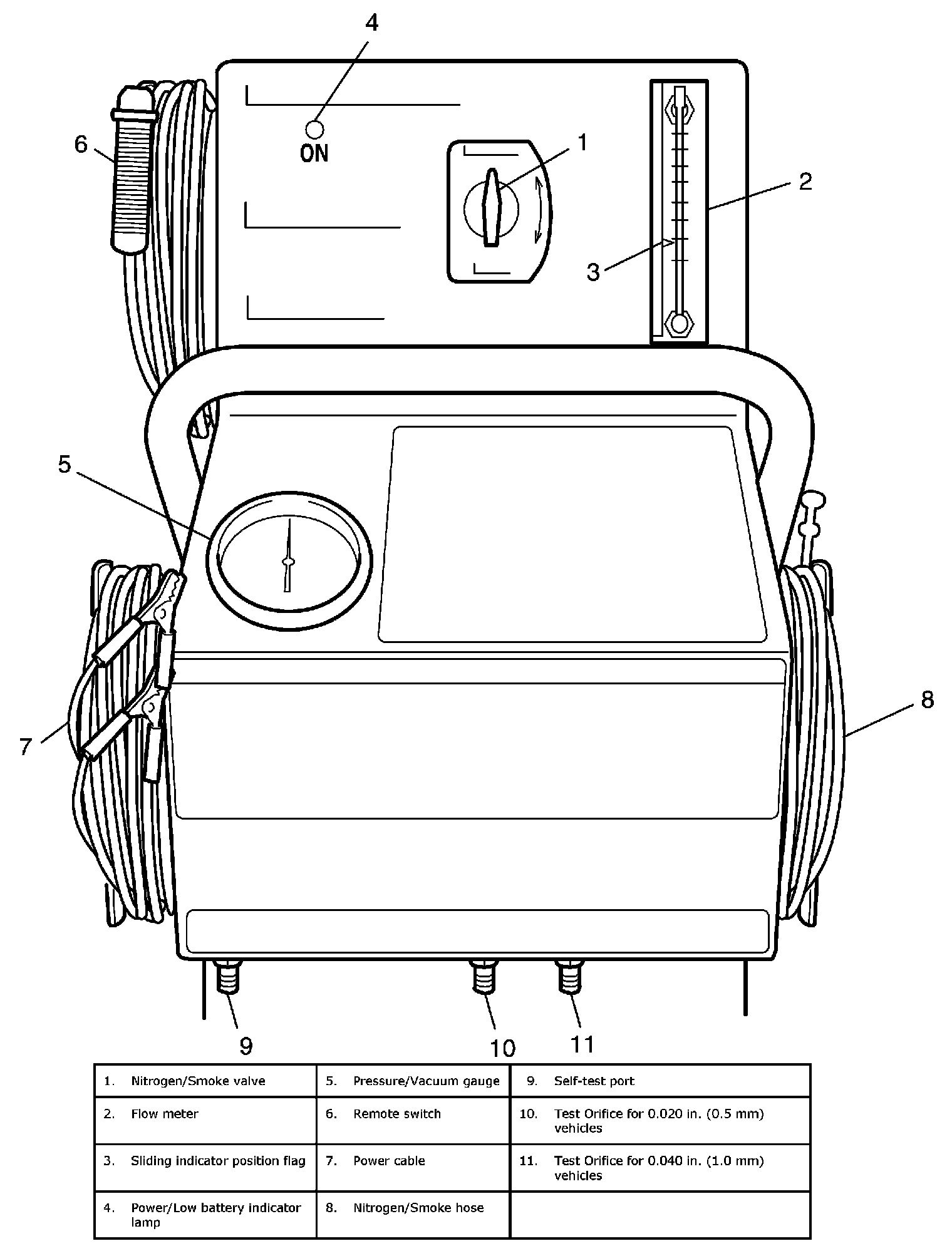 3. Connect the nitrogen/smoke hose (2) to 0.020 in. (0.5 mm) test orifice (3) on the bottom-front of the tester.