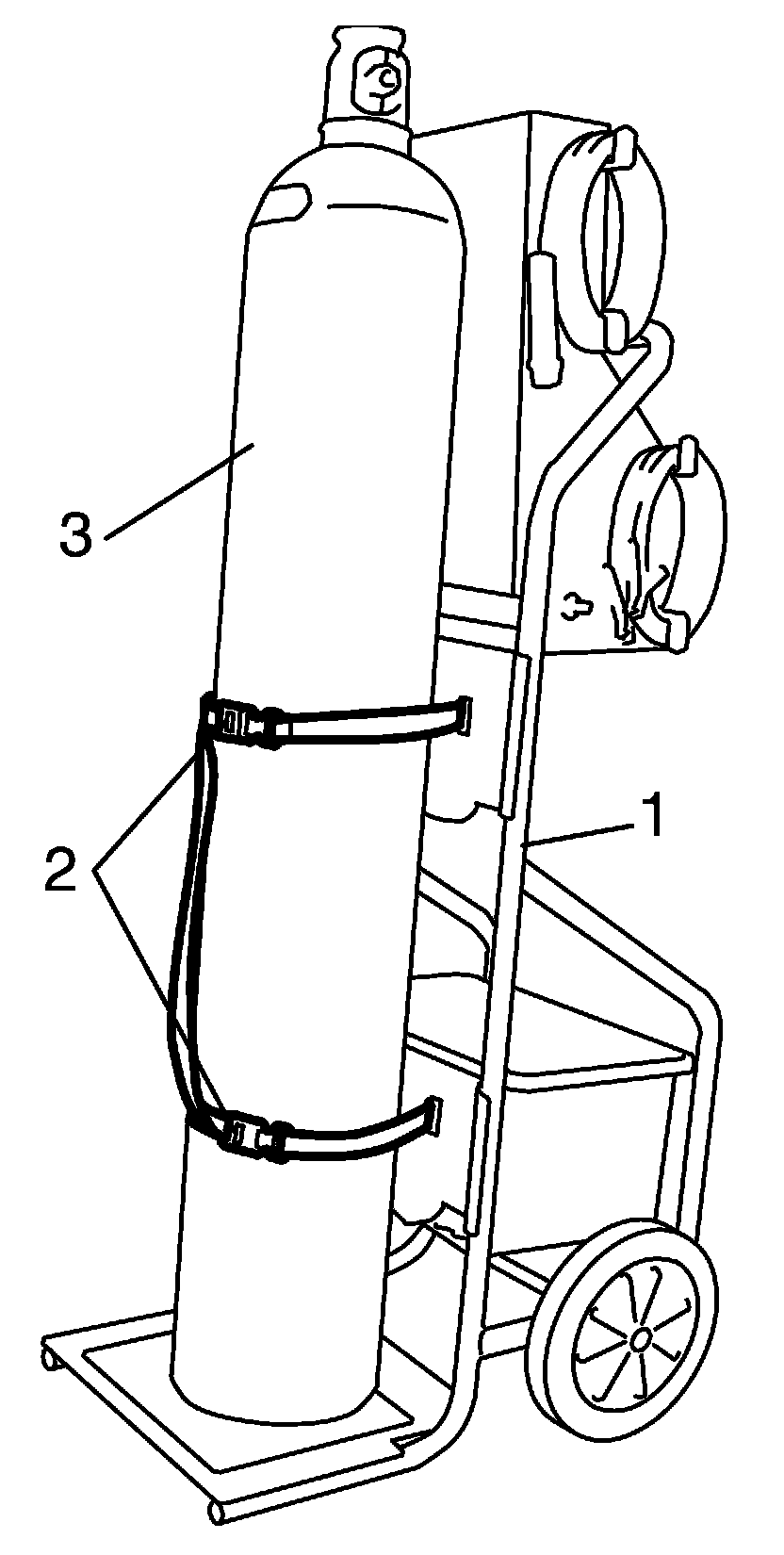 4. Attach the nitrogen tank (3) securely to the EVAP cart (1) by using the tank fixing bands (2) that should be attached to the EVAP cart (1).