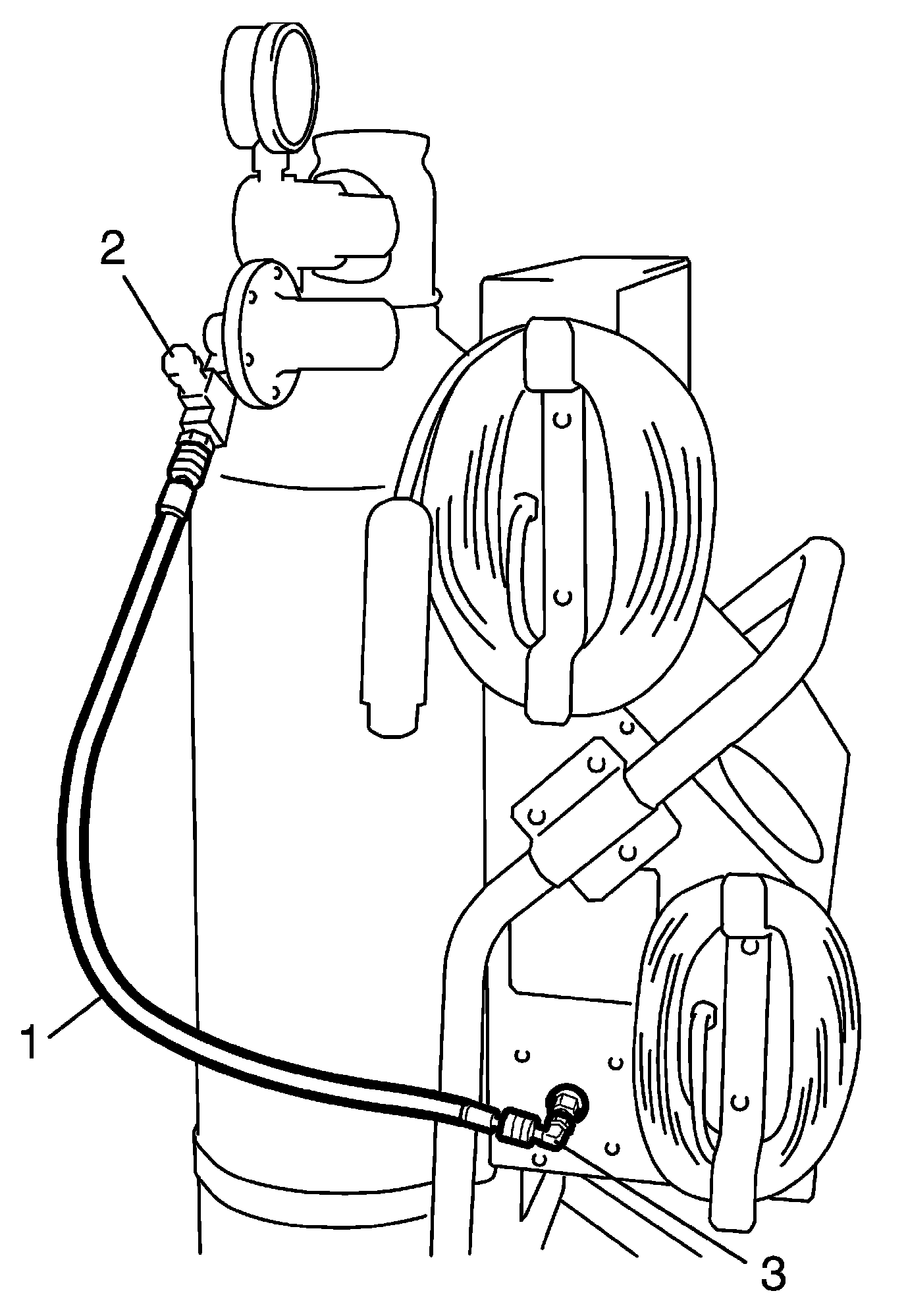 9. Connect regulator to tester hose (1) to pressure regulator (2) and 90 ° adapter (3).