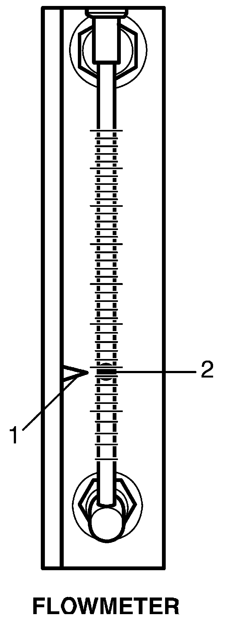 5. Position the red flag (1) on the flowmeter to align with the floating indicator (2). When the red flag is set, press and release the remote switch to deactivate the tester.