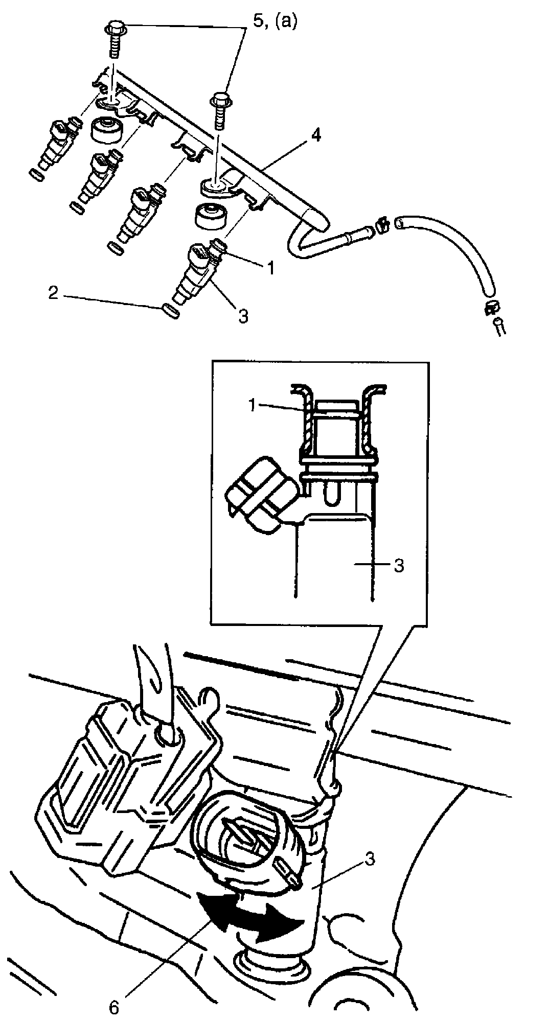 ^ Tighten delivery pipe bolts (5) to specified torque and make sure that injectors rotate smoothly.