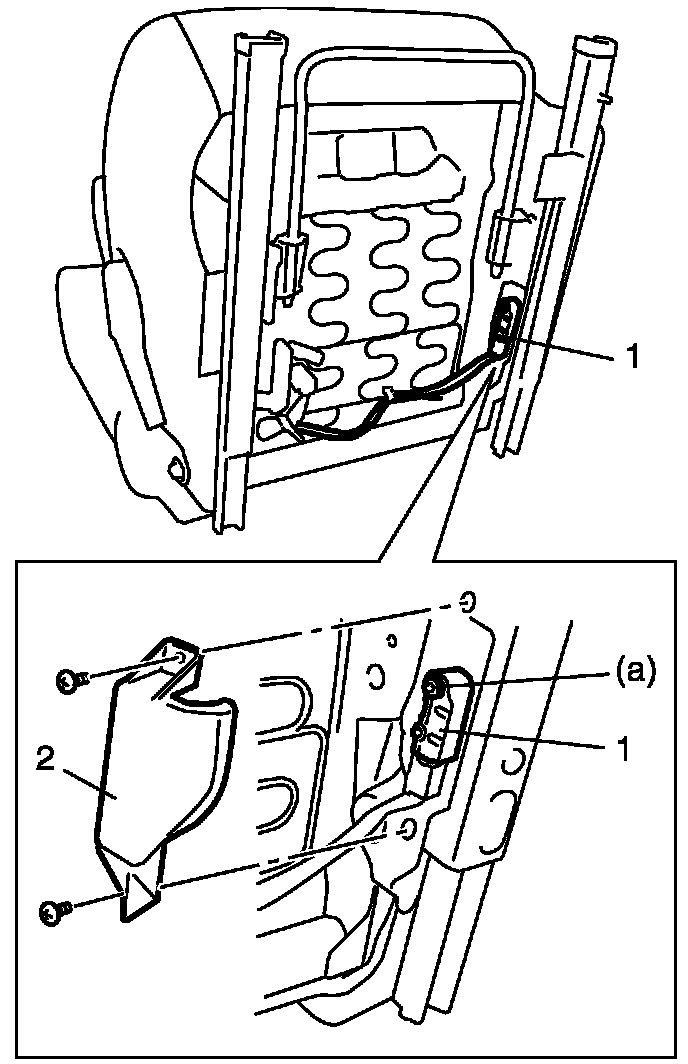 6. Remove seat position sensor bolt (1) and seat position sensor (2) from seat adjuster.