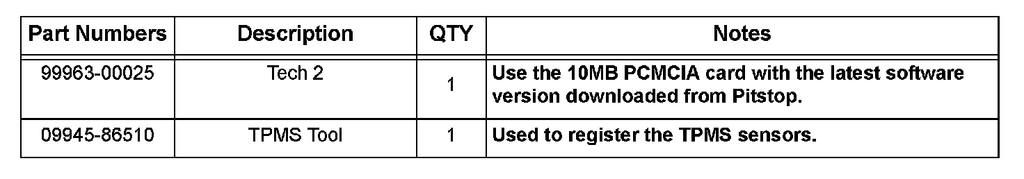 Follow the instructions shown in the service manual under "Diagnostic Information and Procedures". Use the Tech 2 to verify final tire pressures by viewing the data from each sensor rather than rely on the accuracy of a mechanical or electronic air gauge. Accuracy deviations within mechanical and electronic measurement devices could result in pressure readings which differ from what the BCM receives. By using the Tech 2 pressure readings you will observe the exact pressure as seen by the TPMS system for warning of pressure changes. Please see tips below for each TPMS light status.