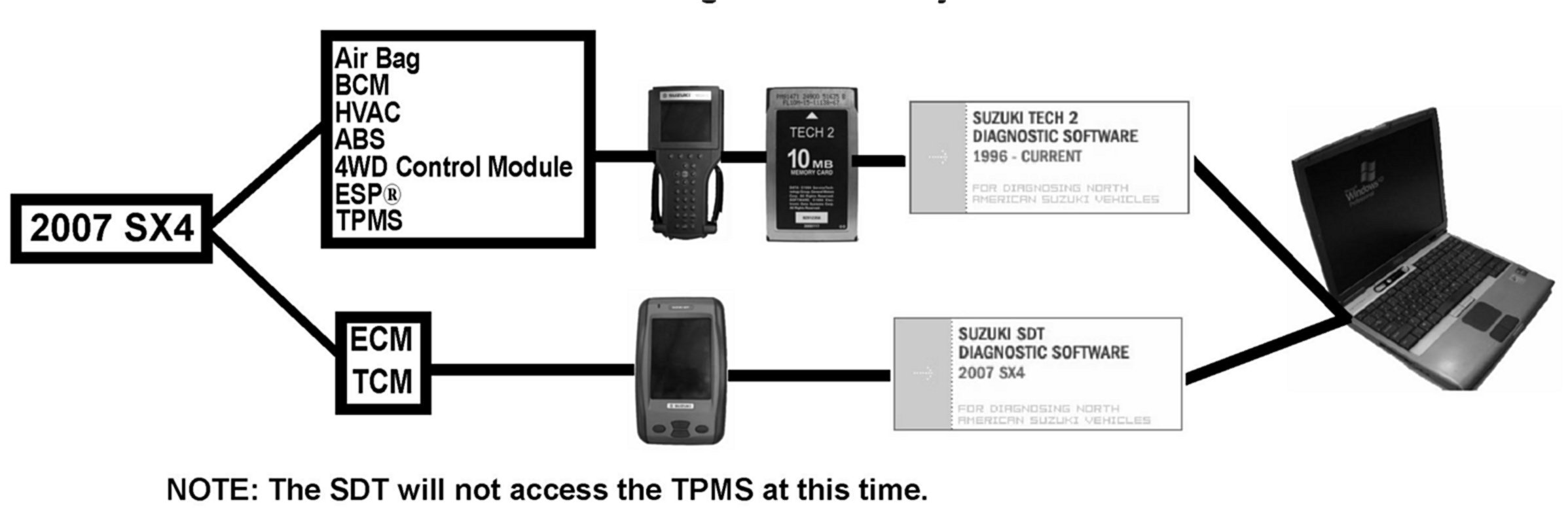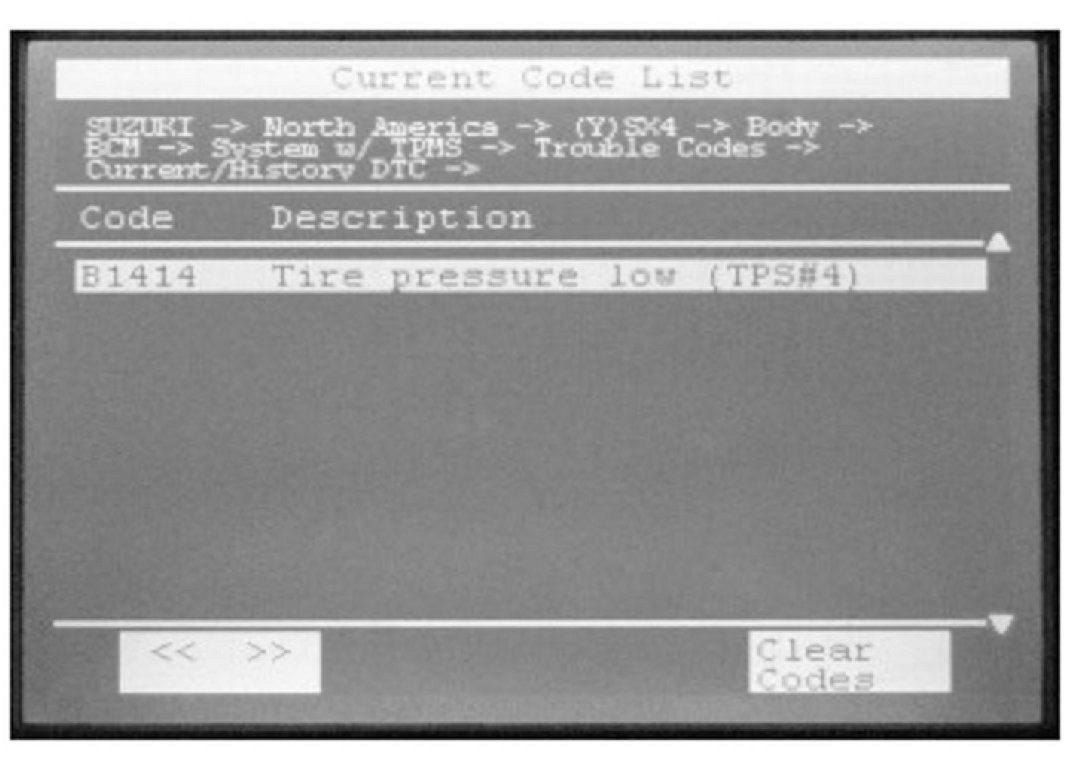 3. With the key "ON" and engine "OFF" power up the Tech 2 and navigate to TPMS trouble codes. SUZUKI -> North America -> (Y) SX4 -> Body -> BCM -> System w/ TPMS -> Trouble Codes. Continue to step 4. Refer to the "Note" in step 6 to locate the affected tire.