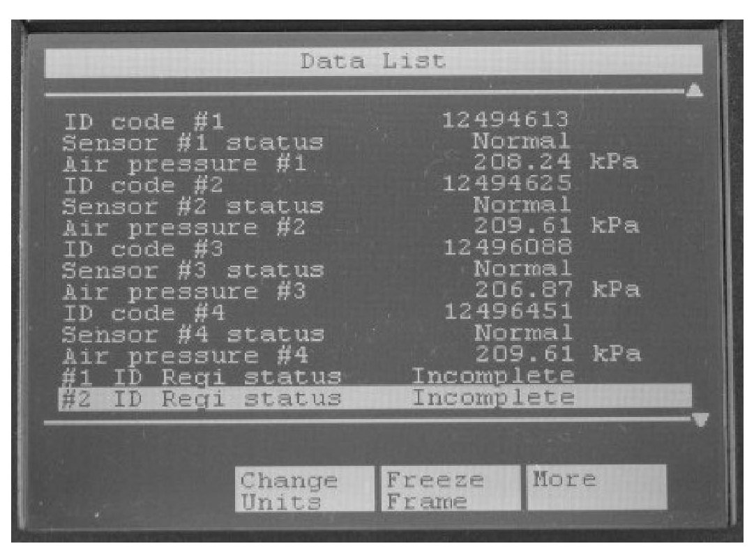 5. Scroll down list until the air pressure is shown. Check the indicated air pressure on the data list. Front and rear tire pressure specification is 230 kPa (33PSI). If the data list shows the pressure out of range adjust the tire pressure. The pressure reading will not update instantly, wait at least 20 seconds for the pressure reading to update. Use the Tech 2 data as the final pressure specification.