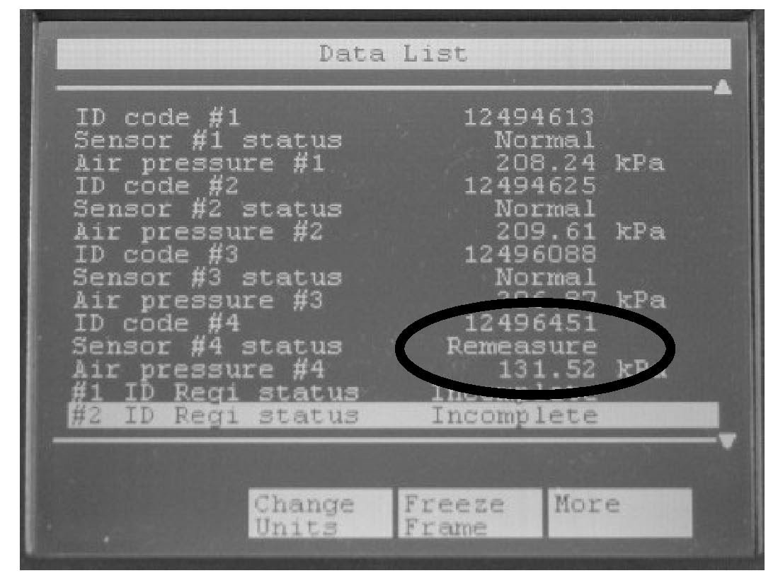 6. When the tire pressure changes 8.3 kPa (1.2 PSI) or more, the "Sensor # 1-4 status" will change to "Remeasure". This mode will increase update frequency from every 60 seconds to between every 2 to 20 seconds.