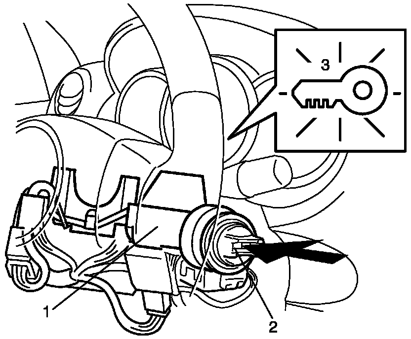 Key Indicator Light CheckPush the ignition knob switch (2) of the steering lock unit (1) and check that the key indicator light (3) in the combination meter lights up in red or blue. If it does not light, go to Key Indicator Light Circuit Check (Key Indicator Light Doesn't Light when Ignition Knob Switch is Pushed).