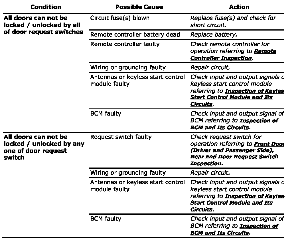 NOTE: Before performing trouble diagnosis procedure for door lock function of keyless start system, check that power door lock system operates properly referring to Power Door Lock System Operation Inspection. If power door lock system does not operate properly, go to Power Door Lock System Symptom Diagnosis. Symptom Related Diagnostic Procedures
