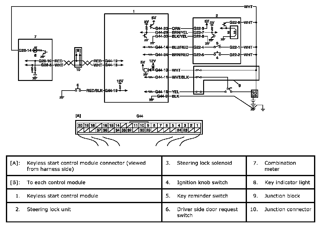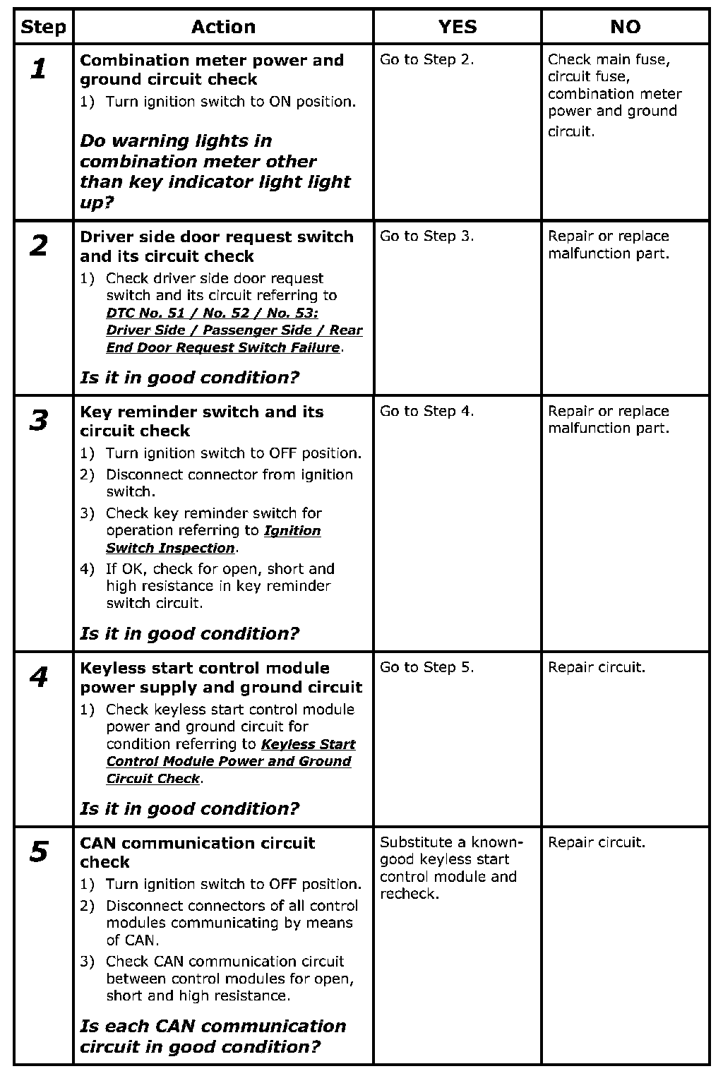 keyless start control module detects DTC by using signals from the key reminder and driver side door request switches. The keyless start control module makes the key indicator light in the combination meter flash on and off by using CAN communication.