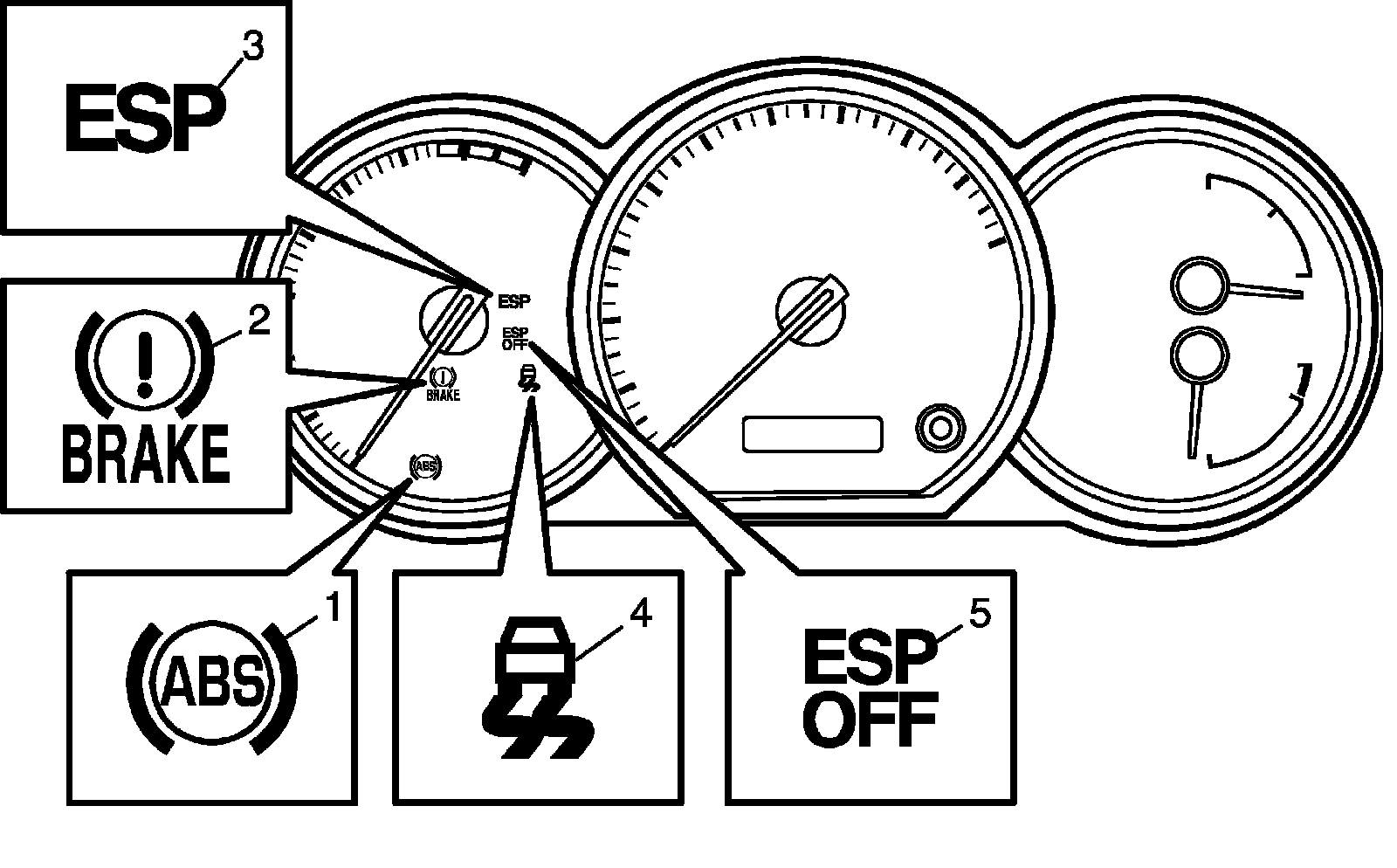 ESP(R) control module monitors each input and output signals. When ESP(R) control module detects any malfunction, some of ABS warning light (1), EBD warning light (brake warning light) (2), ESP(R) warning light (3), SLIP indicator light (4), ESP(R) OFF light (5) are turned ON and indicate the abnormality to driver.