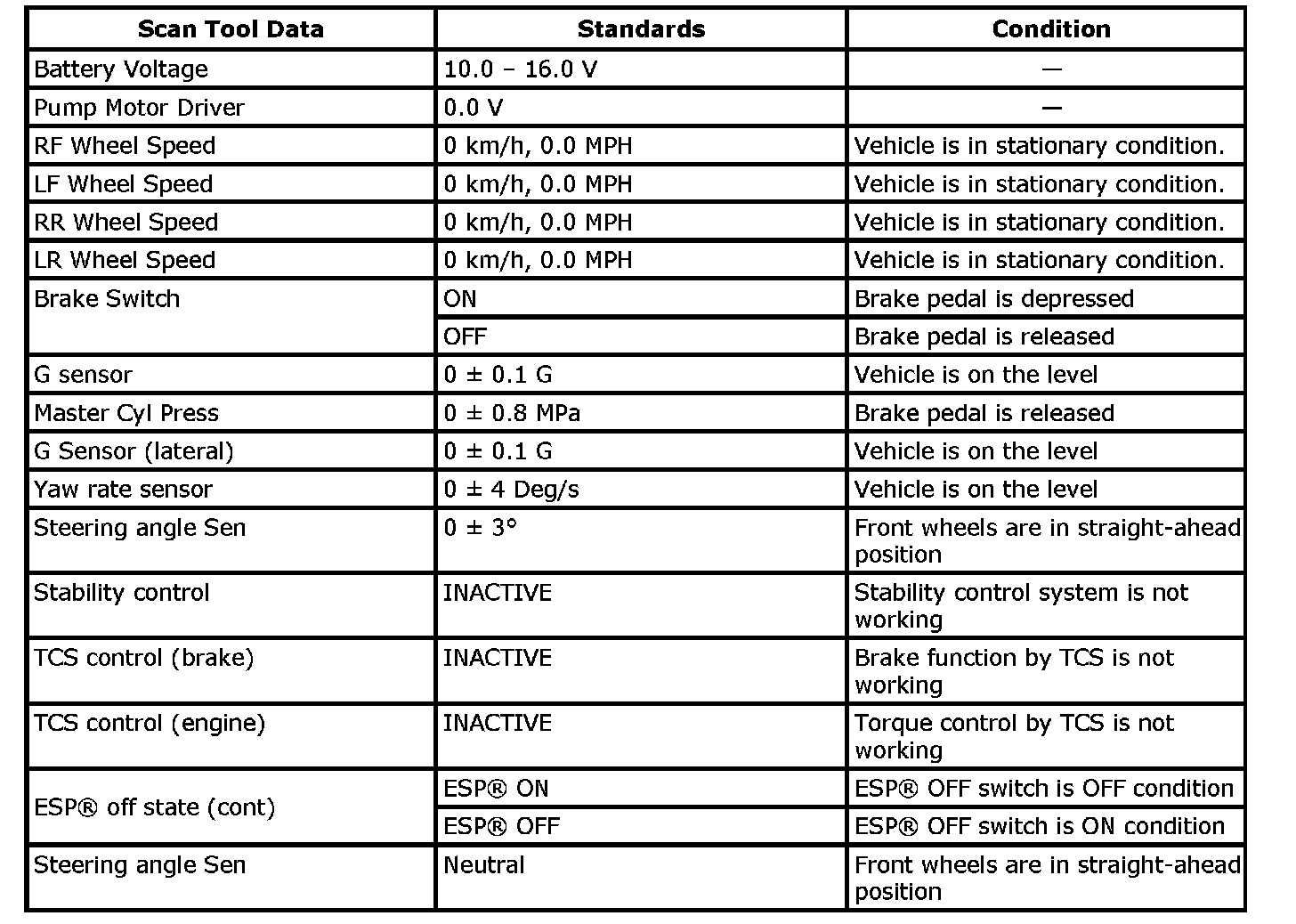 Scan Tool DataThe parameter data below are values measured with the scan tool when the normally operating vehicle is under the following conditions. When taking measurements for comparison by using the scan tool, be sure to check that the vehicle is under the following conditions.