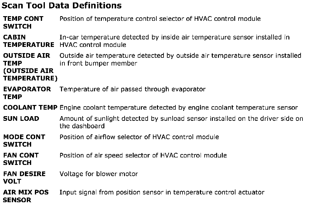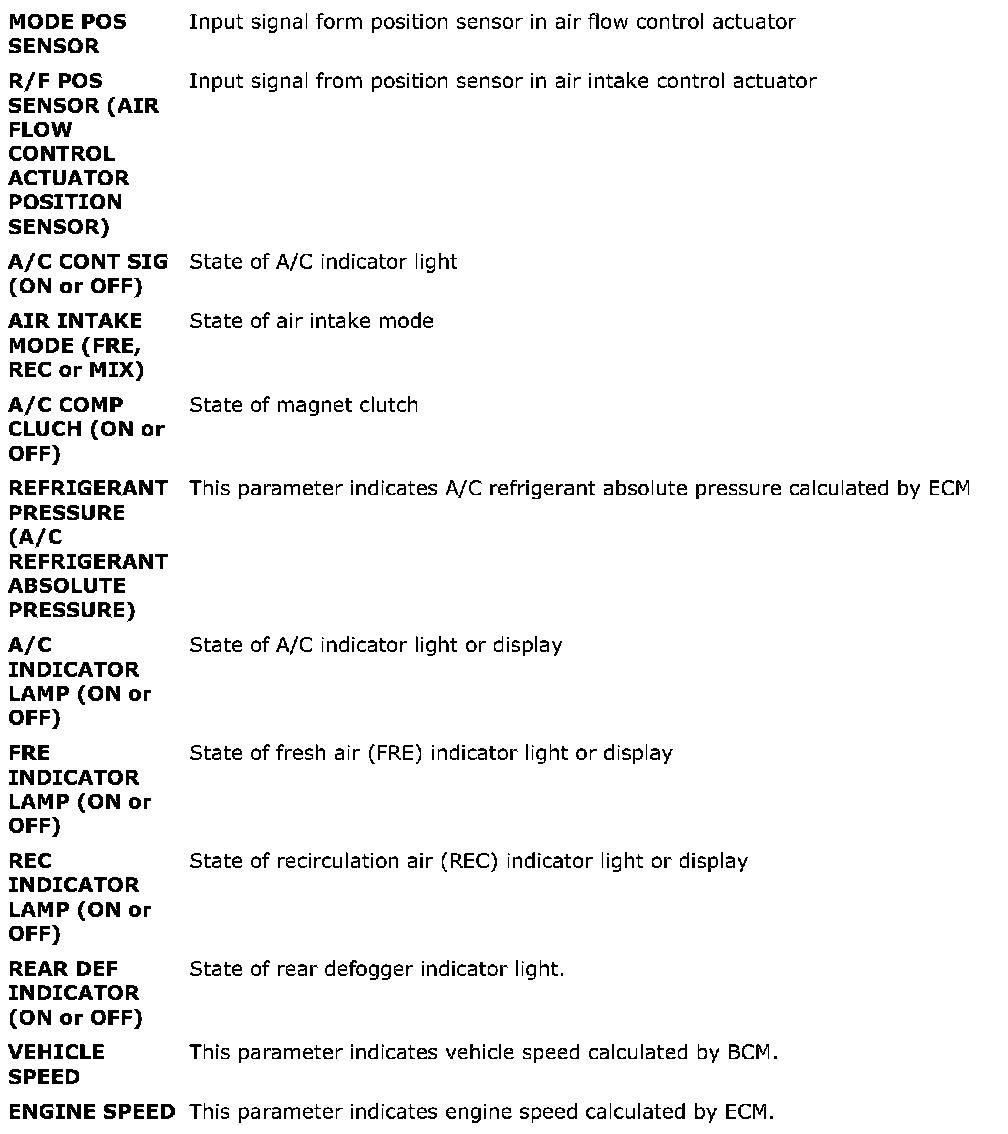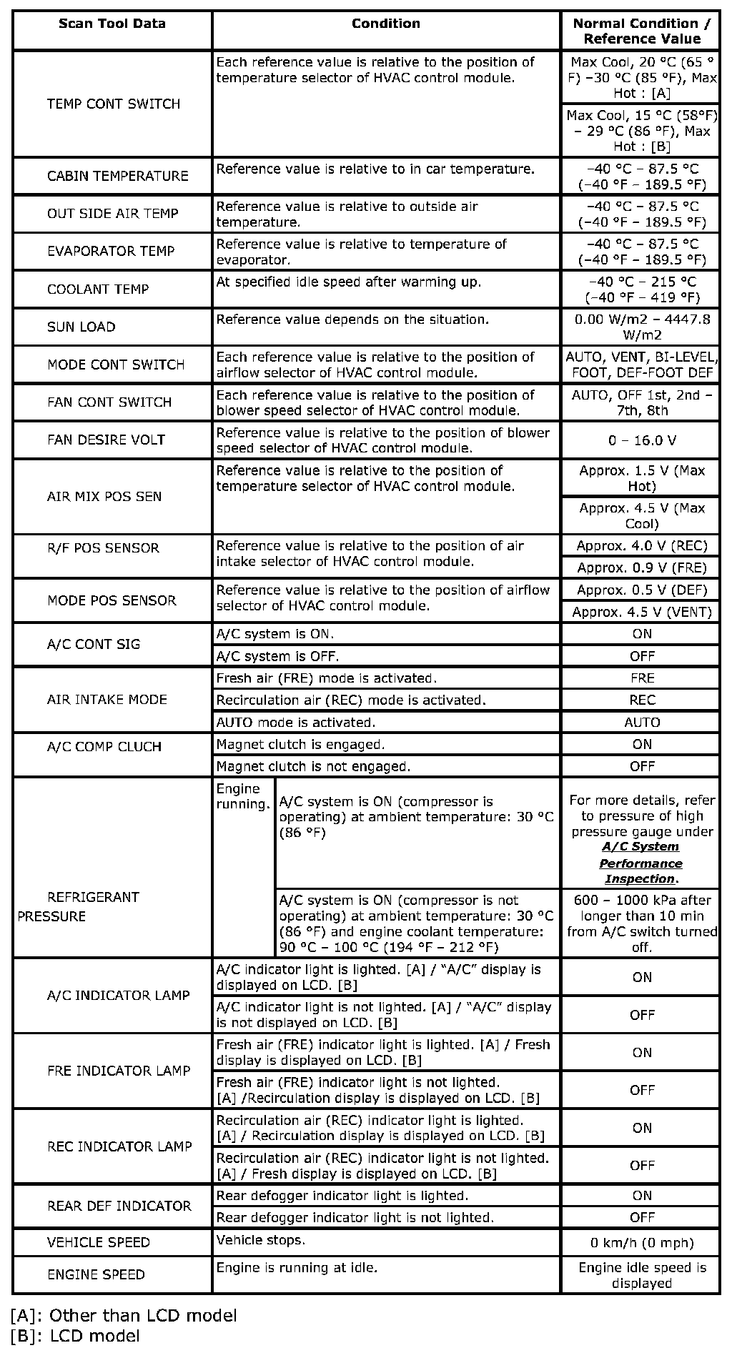 Scan Tool DataAs the data values given below are standard values estimated on the basis of values obtained from the normally operating vehicles by using a scan tool, use them as reference values. Even when the vehicles are in good condition, there may be cases where the checked values do not fall within each specifies data range. Therefore, judgement as abnormal should not be made by checking with these data alone.