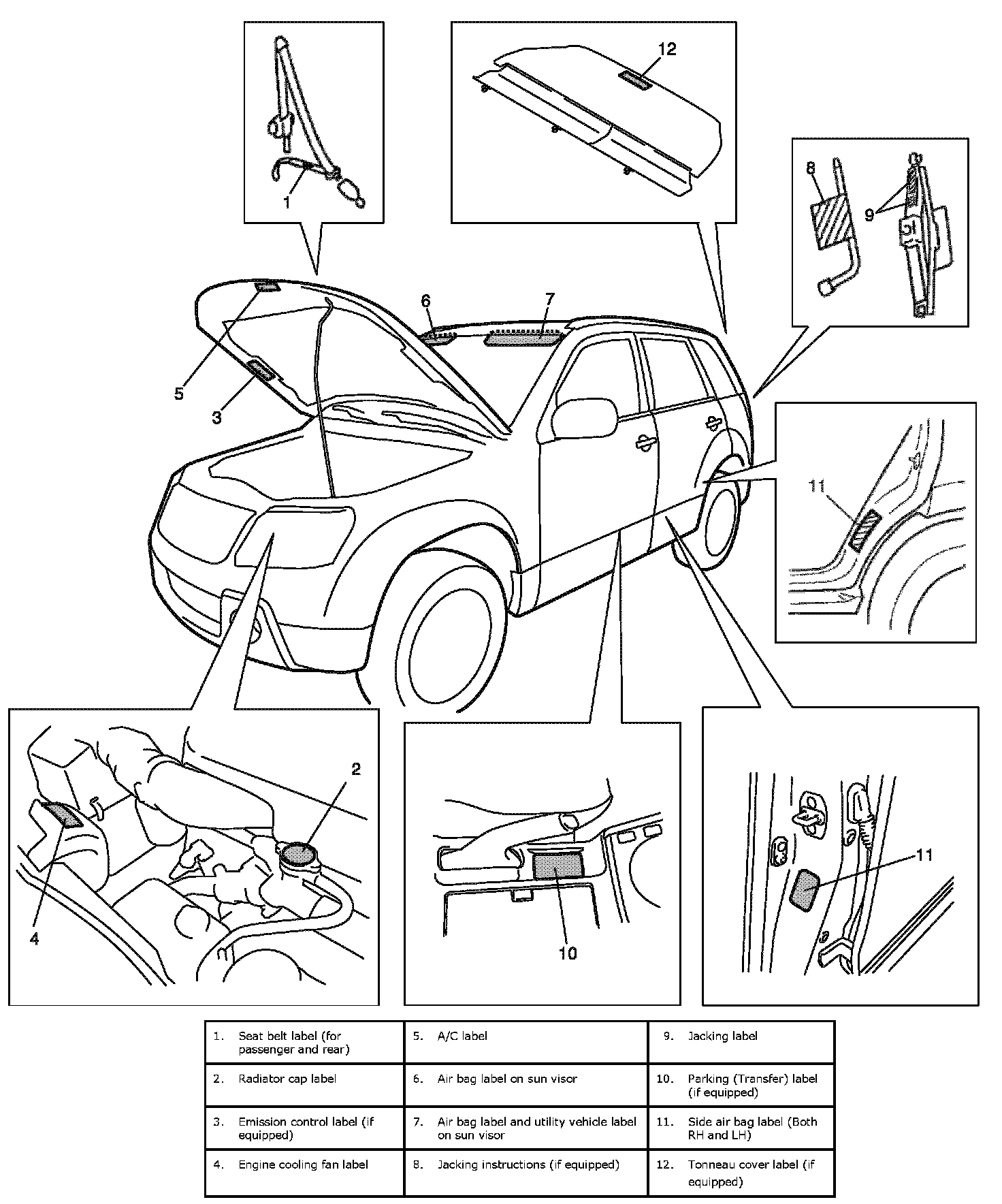 Warning, Caution and Information Label LocationThe figure shows main labels among others that are attached to vehicle component parts. When servicing and handling parts, refer to WARNING / CAUTION instructions printed on labels. If any WARNING / CAUTION label is found stained or damaged, clean or replace it as necessary.