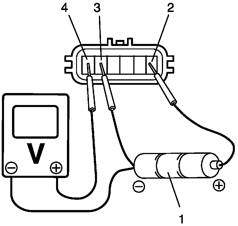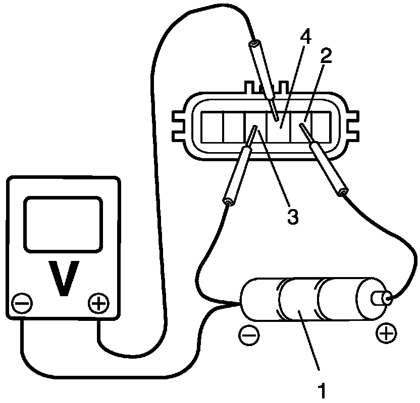 1. For accelerator pedal position (APP) sensor (main), arrange 3 new 1.5 V batteries (1) in series (check that total voltage is 4.7 - 5.0 V) and connect its positive terminal to "Vin 1" terminal (2) and negative terminal to "Ground 1" terminal (3) of sensor. Then using voltmeter, connect positive terminal to "Vout 1" terminal (4) of sensor and negative terminal to battery.