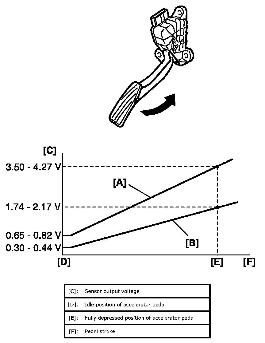 If sensor voltage is out of specified value or does not vary linearly as the following graph, replace accelerator pedal position (APP) sensor assembly.