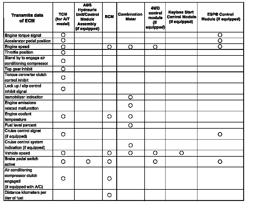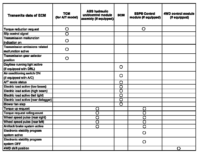 NOTE: In communication between ECM and combination meter, between ECM and keyless start control module (if equipped) and between ECM and 4WD control module (if equipped), data is transmitted only from ECM to combination meter, keyless start control module (if equipped) and 4WD control module (if equipped). (Combination meter, keyless start control module (if equipped) and 4WD control module (if equipped) does not transmit data to ECM.)