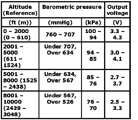 Manifold absolute pressure output voltage ("Vin" voltage: 4.7 - 5.5 V, ambient temp. 20 - 30°C (68 - 86°F))