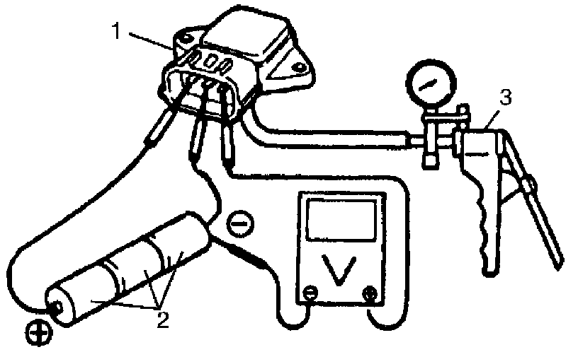 2. Arrange new three 1.5 V batteries (2) in series and connect its positive terminal to "Vin" terminal and negative terminal to "Ground" terminal. Then, check voltage between "Vout" and "Ground". Also, check if voltage reduces when vacuum is slowly applied up to 400 mmHg by using vacuum pump (3). If check result is not satisfactory, replace manifold absolute pressure sensor (1).