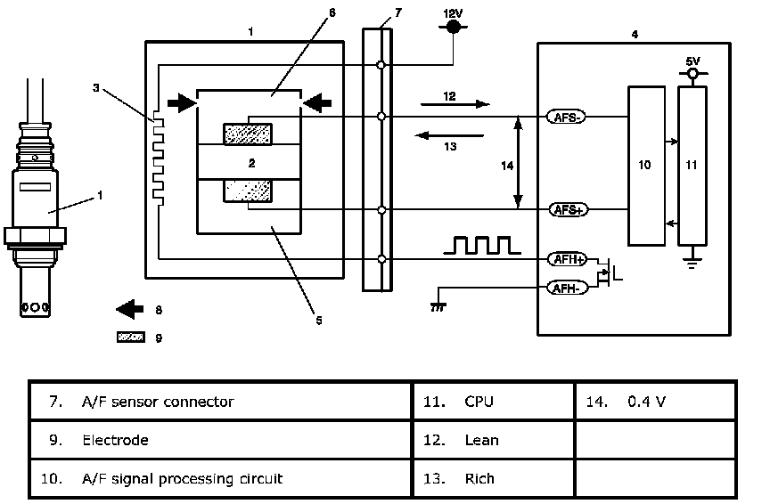 A/F sensor detects oxygen concentration in exhaust gas (8) (A/F ratio of the air-fuel mixture) linearly, ranging from LEAN to RICH.
