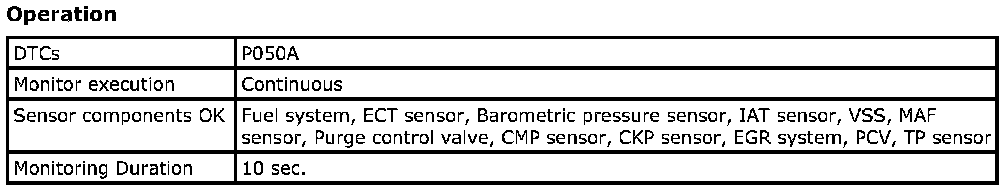 Refer to DTC P050A / P050B: Cold Start Idle Air Control System Performance / Cold Start Ignition Timing Performance.