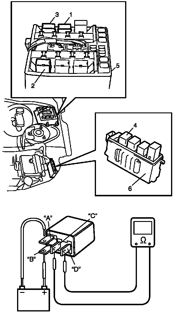 4. Connect battery positive (+) terminal to terminal "B" of relay. Connect battery negative (-) terminal to terminal "A" of relay. Check for continuity between terminal "C" and "D". If there is no continuity when relay is connected to the battery, replace defective relay.