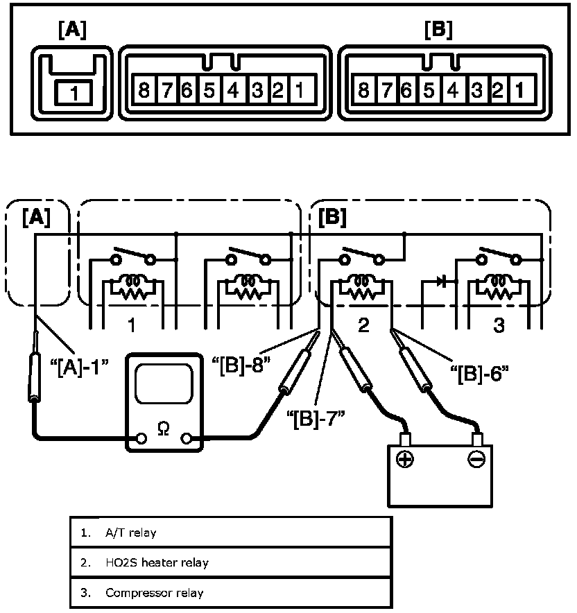3. Check that there is no continuity between terminals "[A]-1" and "[B]-8" of relay. If there is continuity, replace relay.
