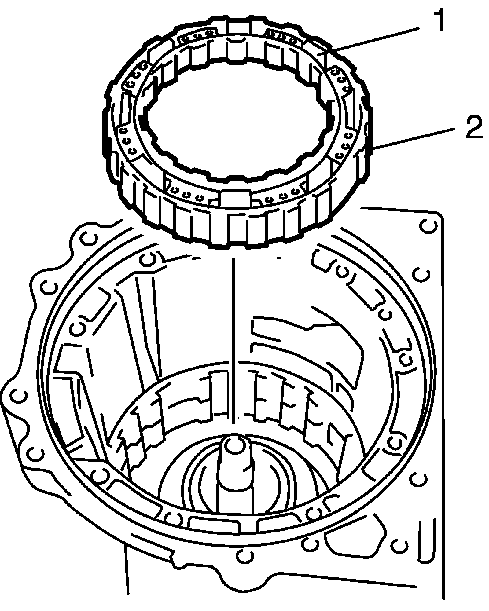 61) Install clutch hub thrust washer (1) and one-way No.2 clutch assembly (2) to transmission case.