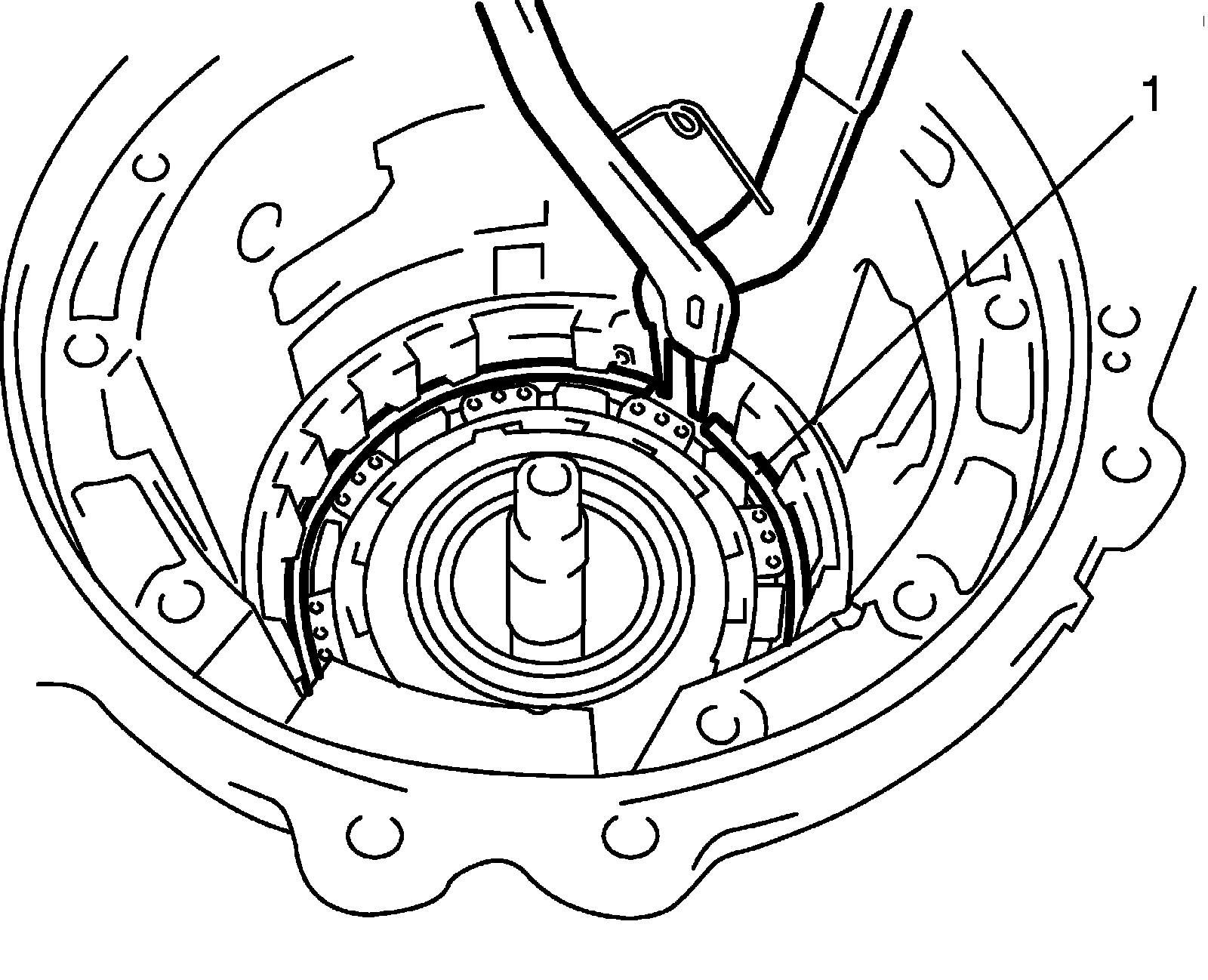 59) Install snap ring (1) by using special tool being sure not to align snap ring end gap with cut portion of transmission case.