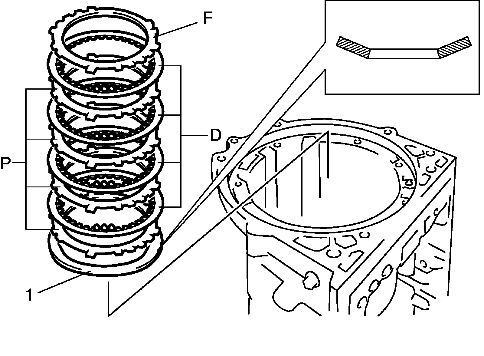 62) Install 2nd (No.3) brake cushion plate (1), 2nd (No.3) brake plates "P" and 2nd (No.3) brake discs "D".