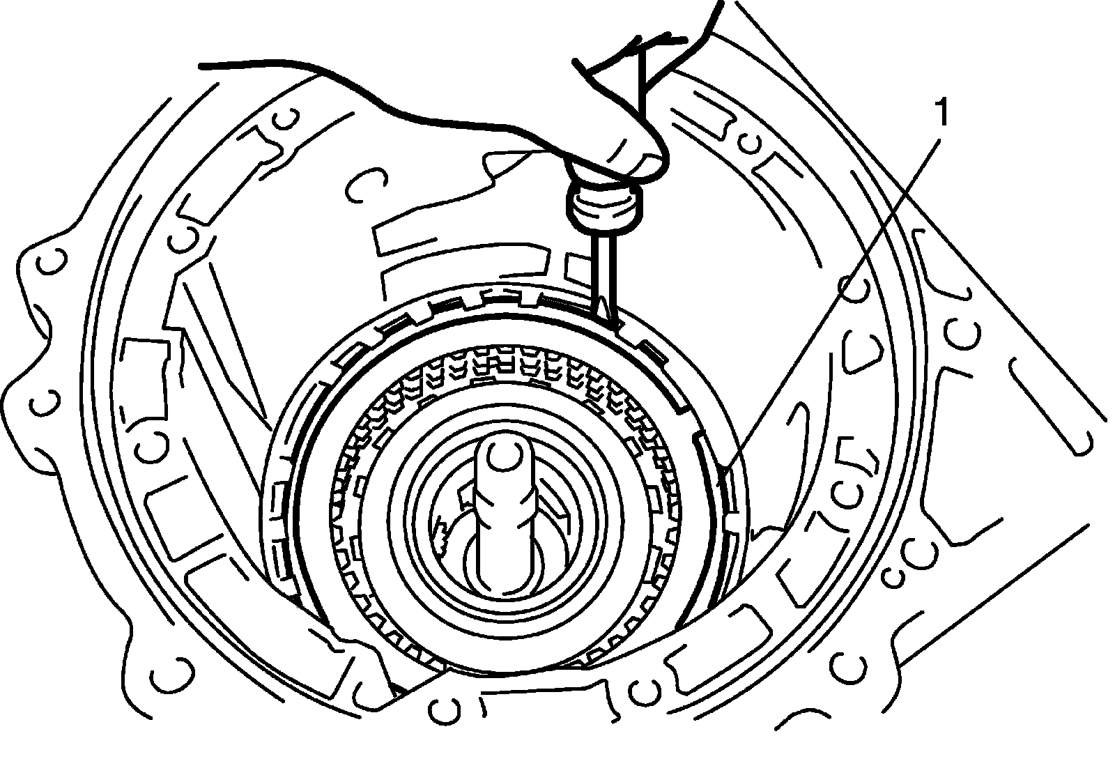 64) Install snap ring (1) by using flat end rod or the like being sure not to align snap ring end gap with cut portion of transmission case.